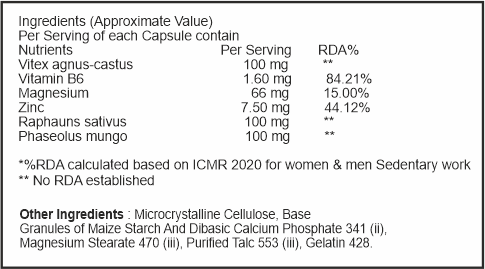 Vitamin B6: Supports healthy hormone metabolism, reduces PMS-related mood swings and bloating, and aids in overall hormonal function.