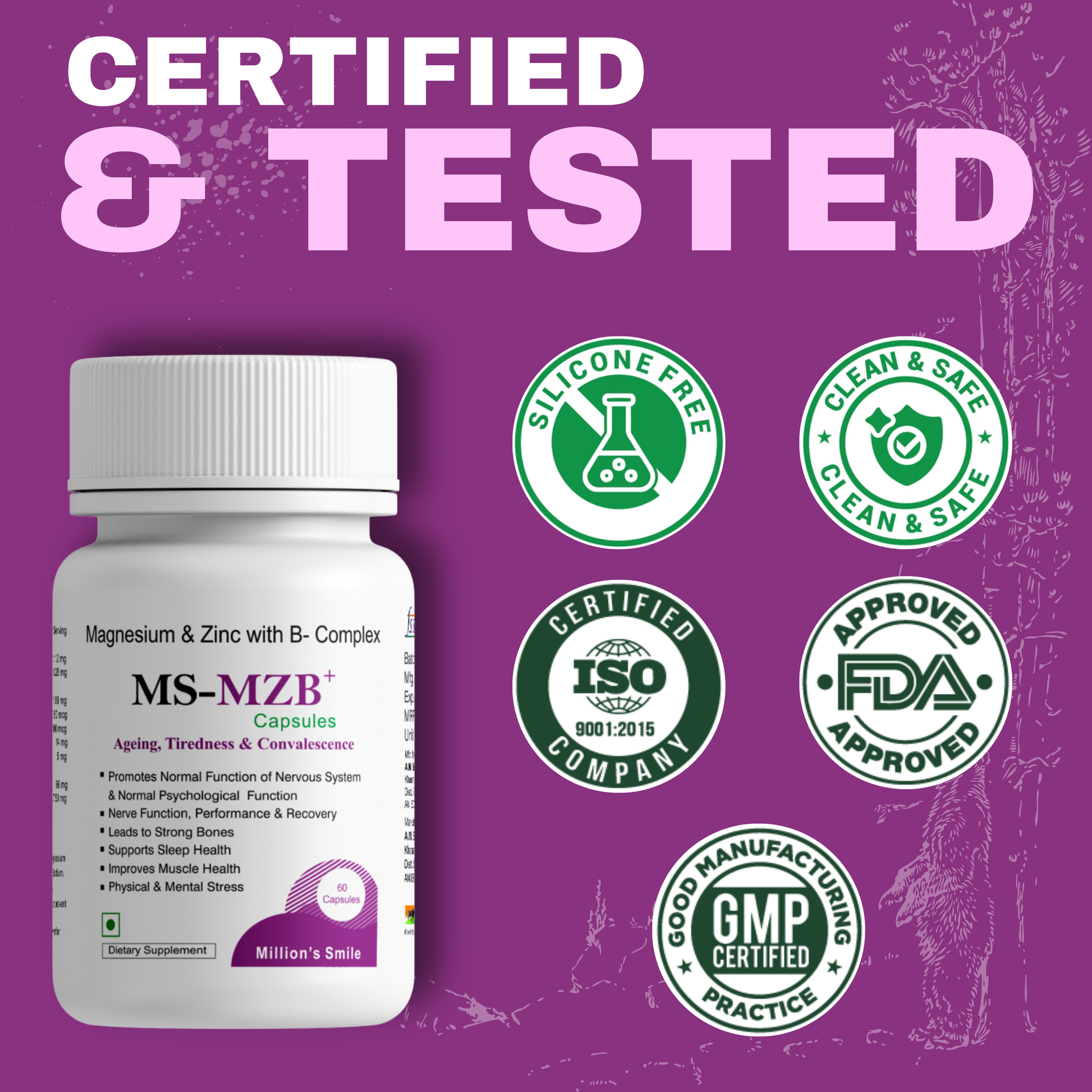 Combat the effects of aging, fatigue, and recovery with MS - MZB+ Capsules, a carefully crafted formula featuring magnesium, zinc, and B complex vitamins. Designed to support vitality and well-being, these capsules are perfect for individuals seeking to regain energy and enhance their overall health during convalescence or as they age.