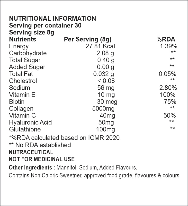 Plant-Based Collagen Powder: Mix 1 scoop in a glass of water and consume once daily.