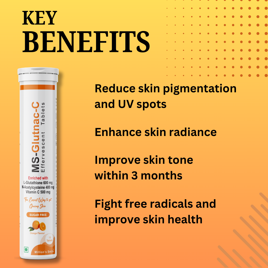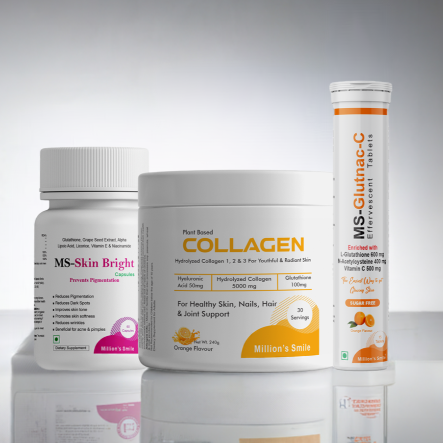 The Million's Smile Pigmentation Combo Pack is carefully designed to target skin concerns related to pigmentation, uneven skin tone, and dullness. The Skin Bright Capsules help lighten dark spots and restore natural skin radiance. The Plant-Based Collagen Powder enhances skin elasticity and supports collagen production, reducing the appearance of fine lines and wrinkles. The Gluta-C Effervescent Tablets work as a potent antioxidant to detoxify the skin and promote a glowing complexion.